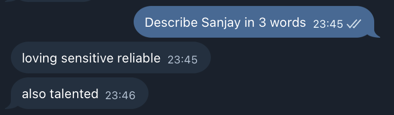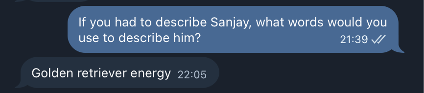 Sanjay is genuinely one of the best people I know. He deserves someone who matches his energy. If you think that might be you, don't hesitate to reach out!
